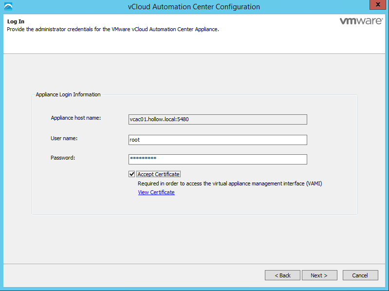Enter the root username and password to connect to the appliance, and click the check box to accept the certificate. Click, next.