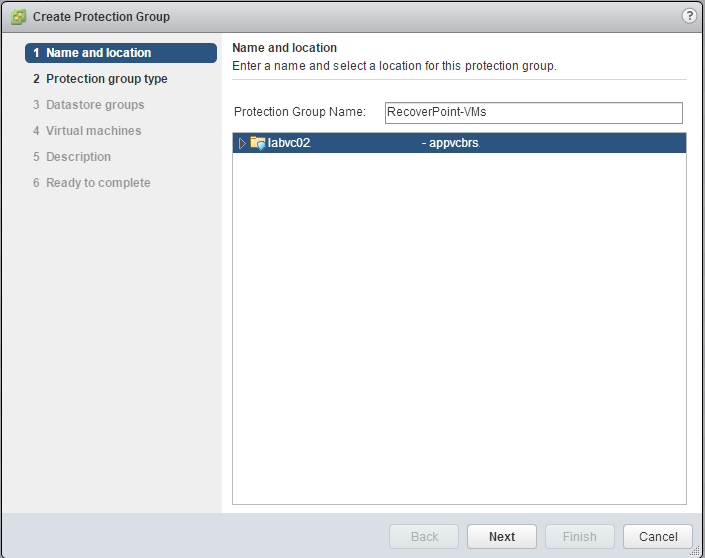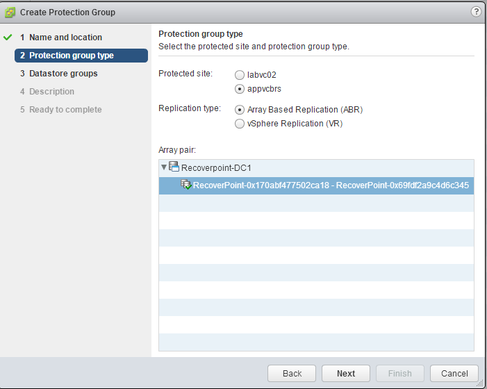 When you create a protection group for virtual machines being replicated by array based replication, you will give it a name as usual, and a site pair.