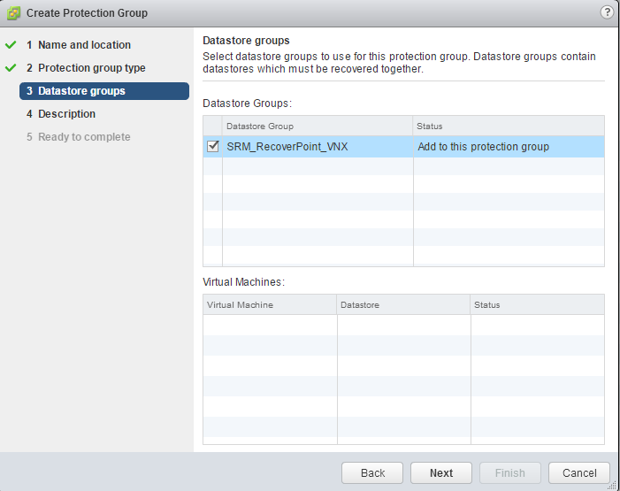 Select the datastores that contain the virtual machines. All of the virtual machines on this array pair will be protected.