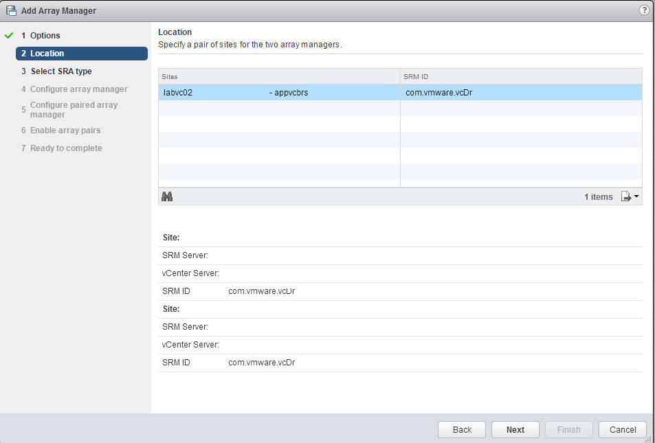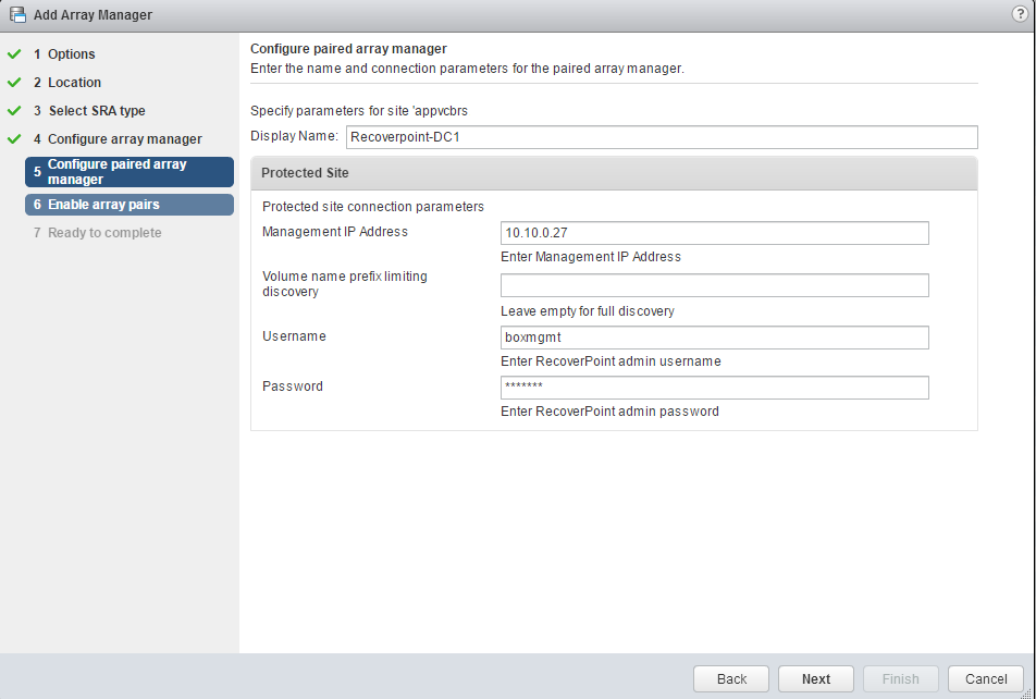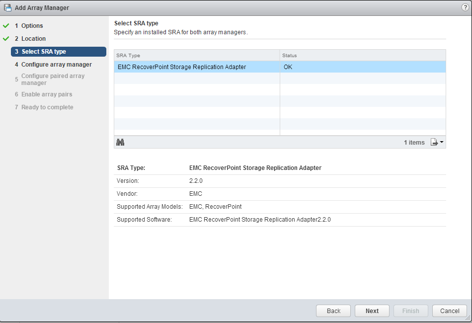 Choose the SRA type. If you only have one SRA installed, only one option should be available. In this case, we’re using EMC RecoverPoint.
