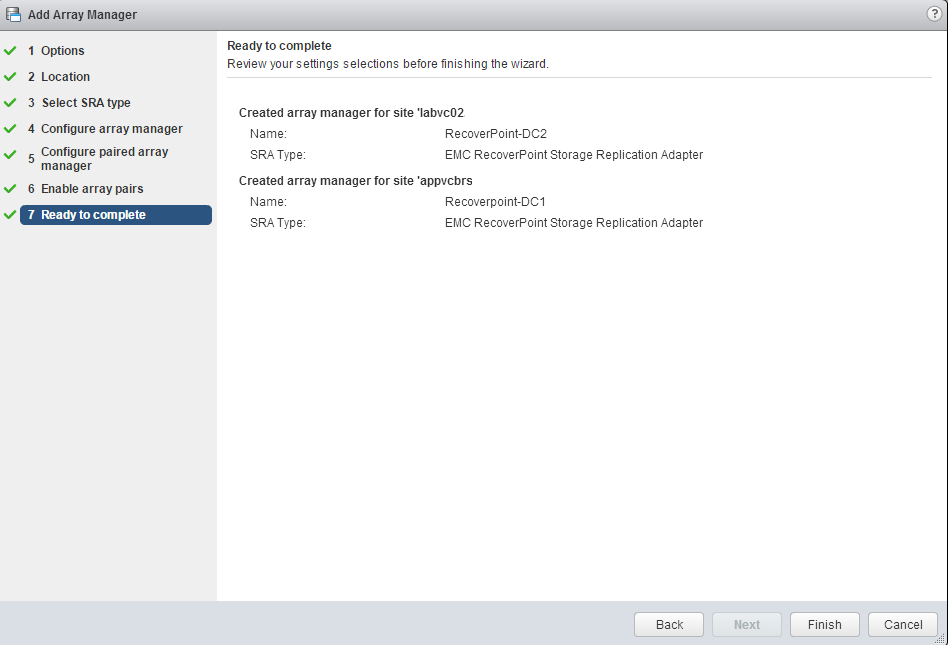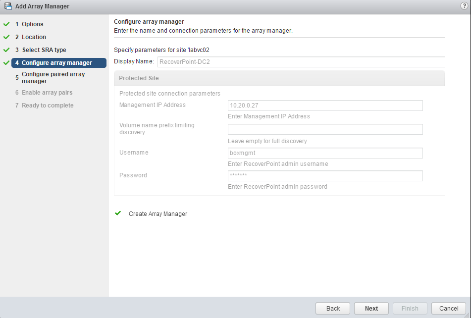 Now we’ll configure the opposite site’s array manager as well. Same rules apply.