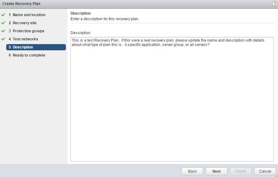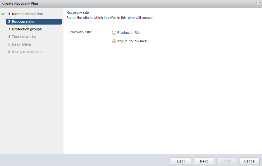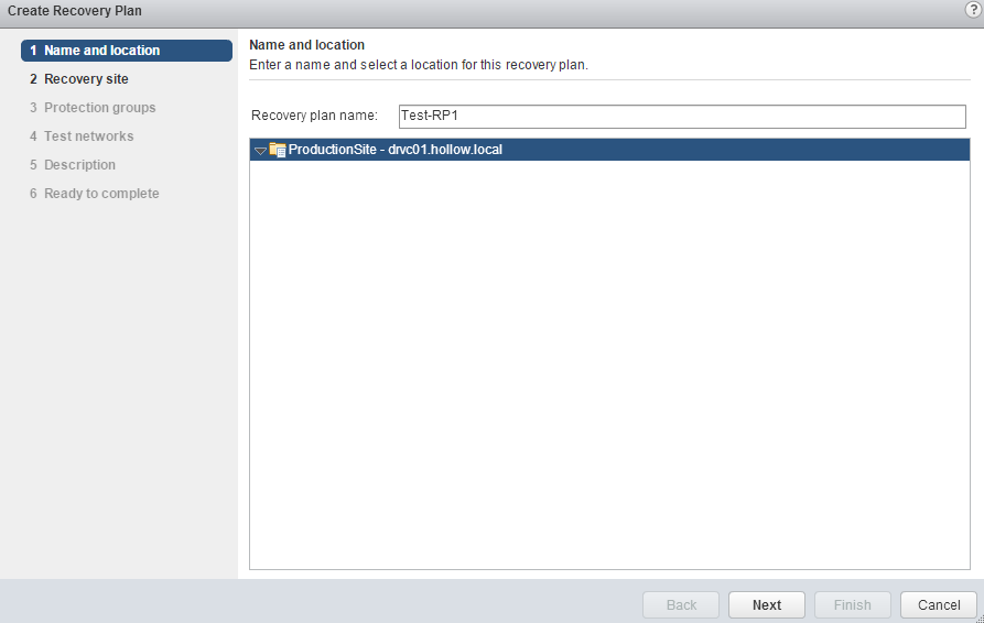 Give the recovery plan a descriptive name. Remember that you can create a recovery plan for individual protection groups, or multiple protection groups. This allows you the opportunity to create individual recovery plans for things like “Mail Services”, “Database Services”, “DMZ”, “File Servers” and then create a catch all named “Full Recovery” that includes all of the protection groups. This allows for flexibility with whatever outage you’re planning for.