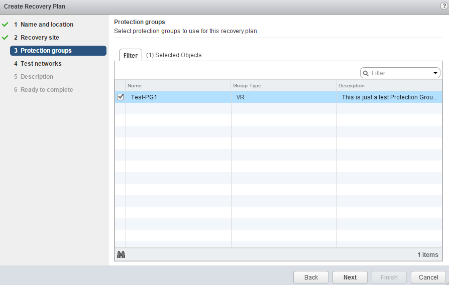 Select the Protection Groups that are part of this recovery plan. In the example below, there is only one protection group, but you could select many if they are available. Click Next.