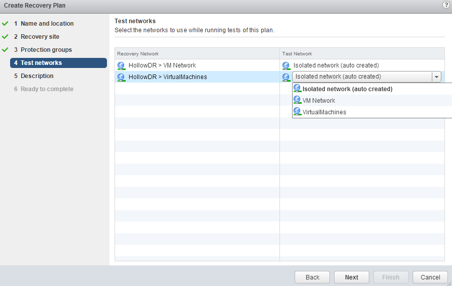 Select the test networks. We’ve already created mapping for networking that should show handle what happens when a virtual machine fails over to the recovery site, but we need to configure what happens when we run a “TEST” recovery. During a failover test, we may not want the VM to be on the same network as our production servers. Leaving the “Isolated network (auto created) as the test network, allows us to create a virtual switch with no uplinks in order to ensure that the virtual machines won’t be accessible via the network during a test.