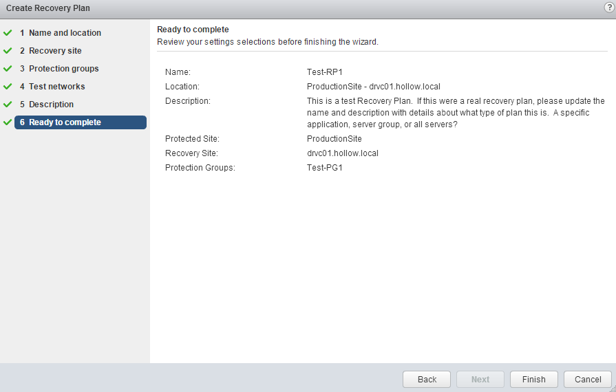 This is the basic layout of a recovery plan. Most disaster recovery plans require a lot more customization than just powering on a virtual machine at another location. In a follow-up post we’ll review many more options that are available when setting up a recovery plan such as IP customization, power-on priorities and scripting.