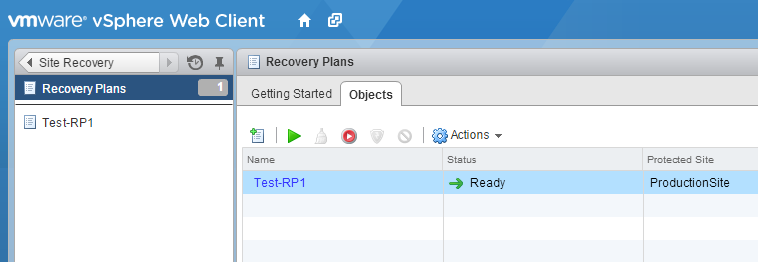 Once done, we can see that a Recovery Plan is available and we can run a test or a failover.