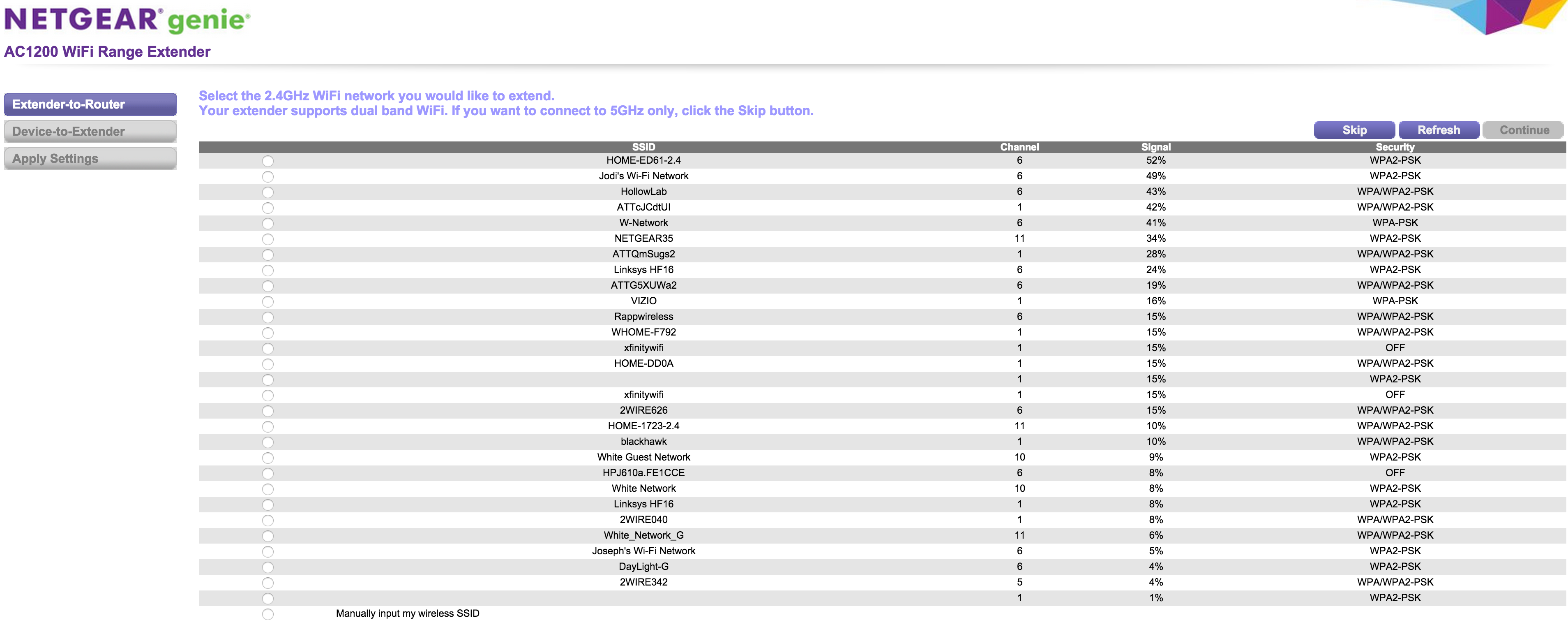 The first thing you do is to select your current wireless network. In my case I have both a 2.4GHz and 5GHz wireless network, but you select the 2.4GHz only first. You can skip this band if you only want 5GHz.