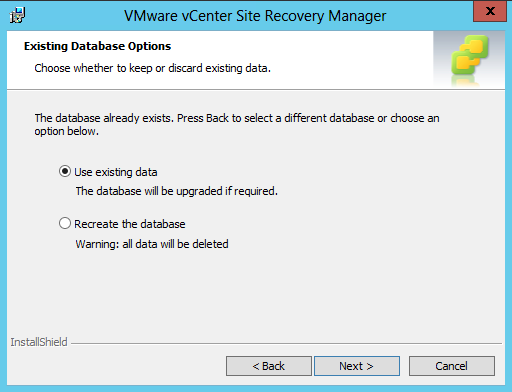 Important!!!! Leave this setting at “Use existing data” or you’ll erase your current SRM config.