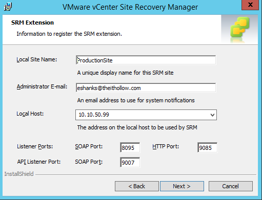 Update the Administrator email, local host and any ports if you wish. The local site name will not be editable. Click Next.