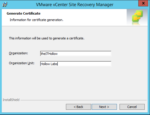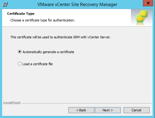 Choose whether to use the automatically generated certificates or load a custom certificate. Remember that if your vCenter uses a custom certificate, you’ll need to use a custom certificate in your install of SRM as well.
