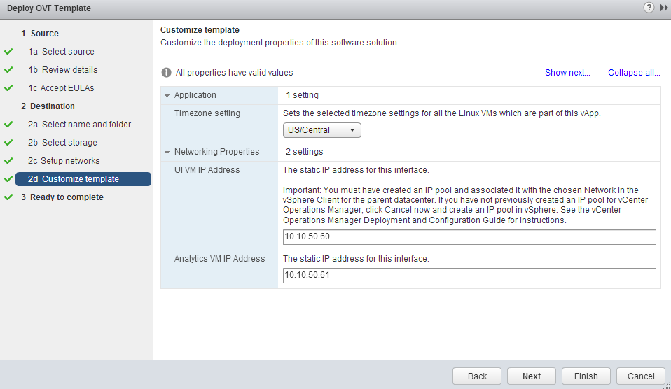 The very next screen you come to will need you to change the timezone, and set the IP addresses of the UI VM and the Analytics VM. We collected all of this information at the very beginning of this post.