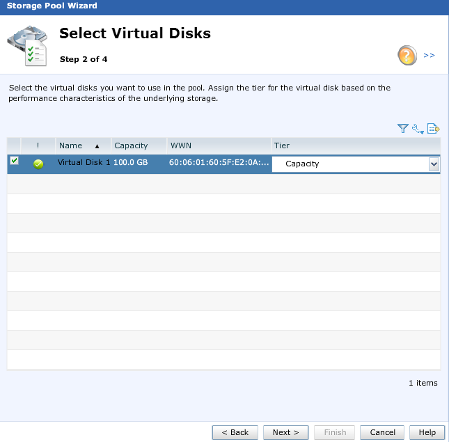 Select the disk that you added earlier. You’ll also select a tier. This could be important if you’ve got both SSD virtual disks assigned, as well as spinning disks. In my case all of the virtual disks I’ve added are tiered on my Synology Storage Array so I just picked capacity.