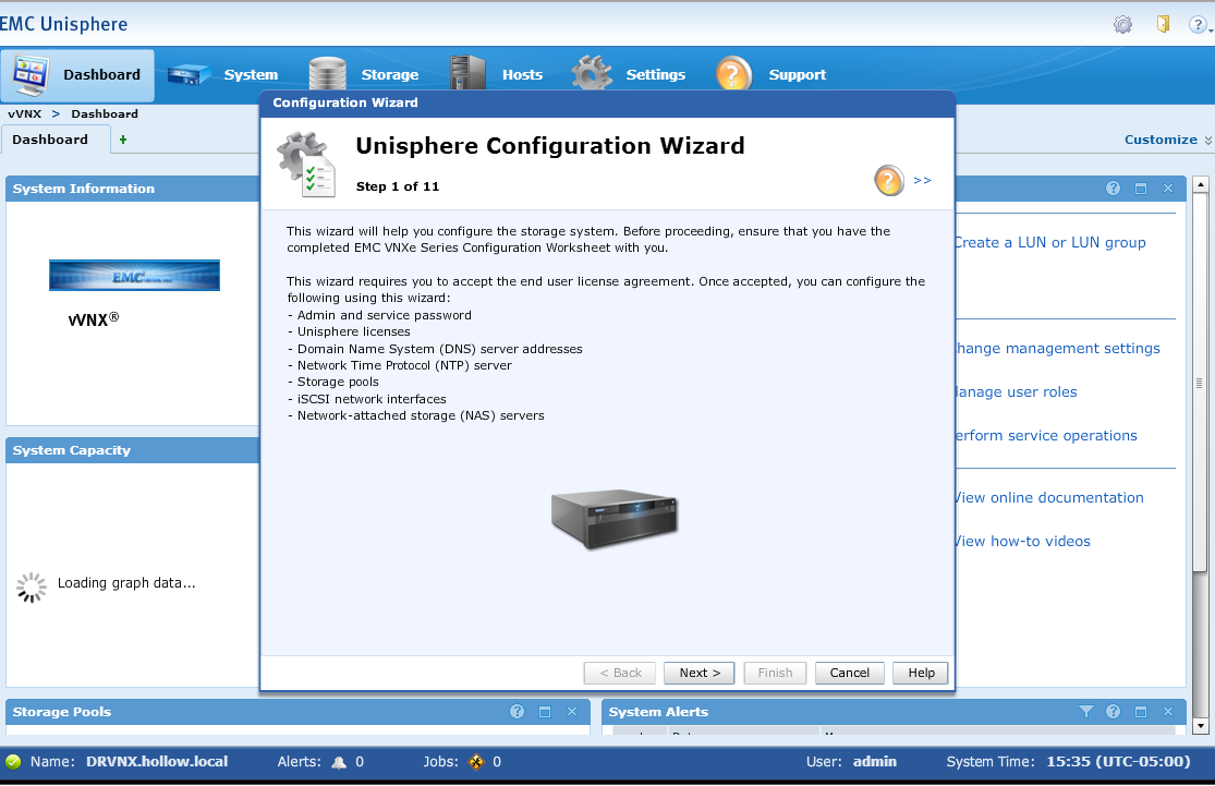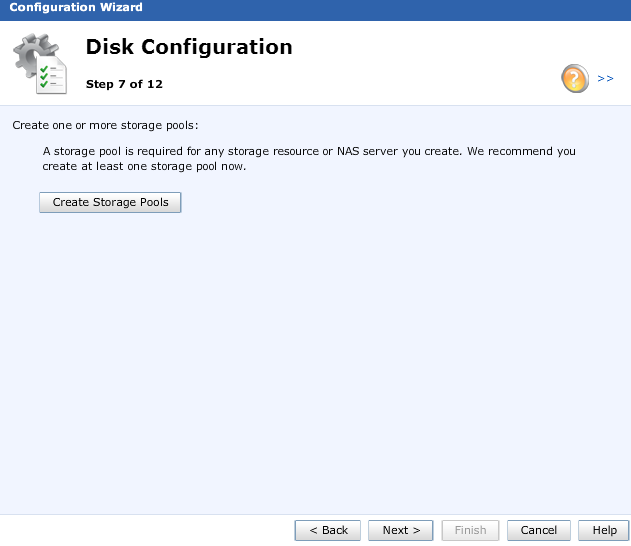 Stop! When you get to the disk configuration take a second and add a new virtual disk to the vVNX array in vSphere. The disk you add will be the disk used to create a storage pool. If you don’t add a virtual disk to the appliance, no pools can be created. Once you’ve added the disk, click the “Create Storage Pools” button.