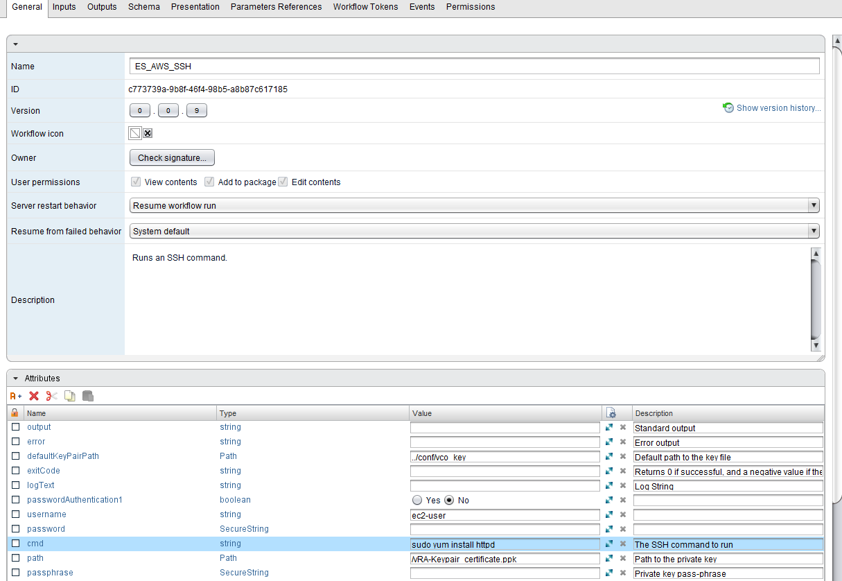 Now the real work begins. We build a workflow to take the vRA information and then connect to the EC2 instance to run an SSH command. The picture below lays out the workflow and order.