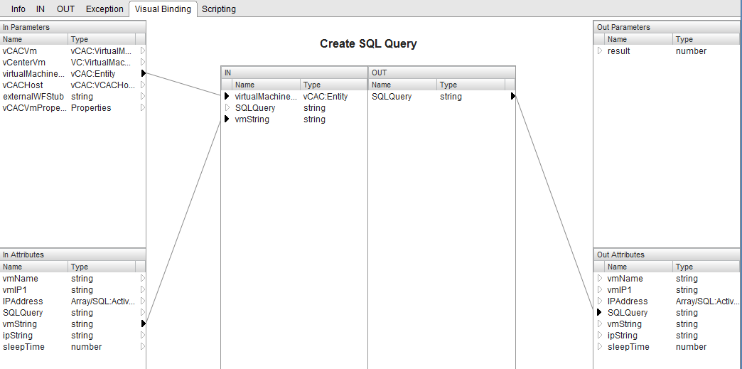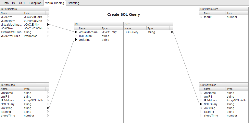 The next piece of the puzzle is a SQL Query. I used another script element to build the SQL Query that I plan to use. This query will be passed along to the next element in the workflow which will actually execute this script. The vCAC:Entity is passed to the script element.