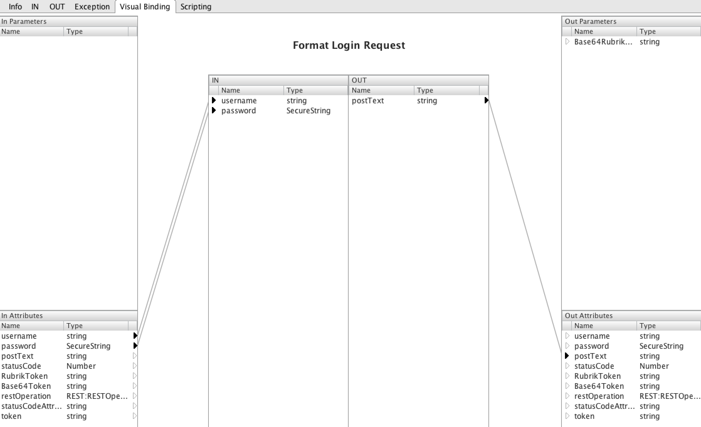 The first element in the workflow attempts to format our username and password so that it can be passed in a REST call. We see from the visual binding that we have inputs of Username and Password and an output of “postText” which will be the string we pass to our POST rest call.