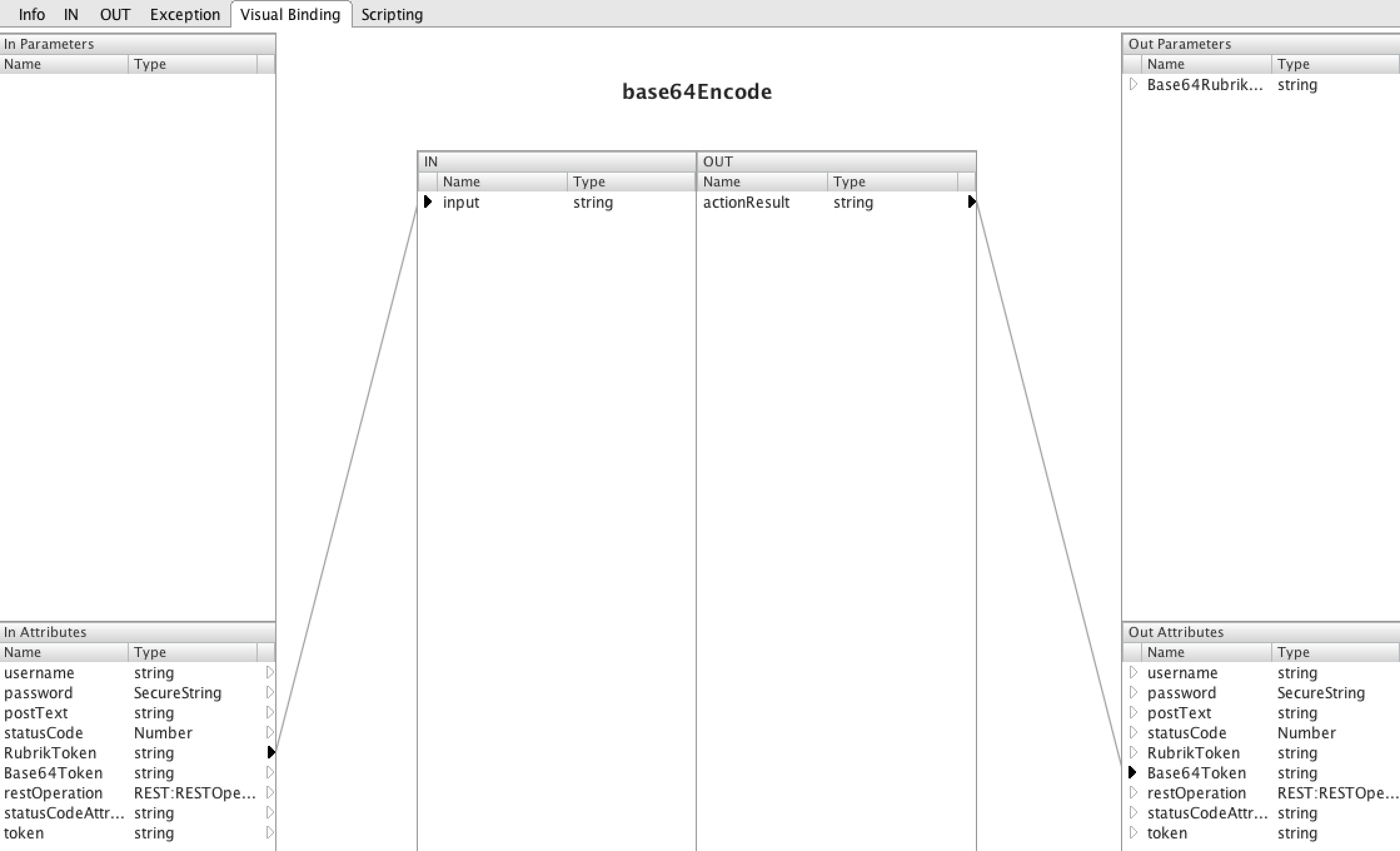 From here, we’ve executed a POST to the appliance and have gotten a token (or cookie if you prefer that term) from the appliance. We pass this token to our next element where we log and format it. You can see from the visual binding tab that we take the output token from the previous element and will output a RubrikToken.