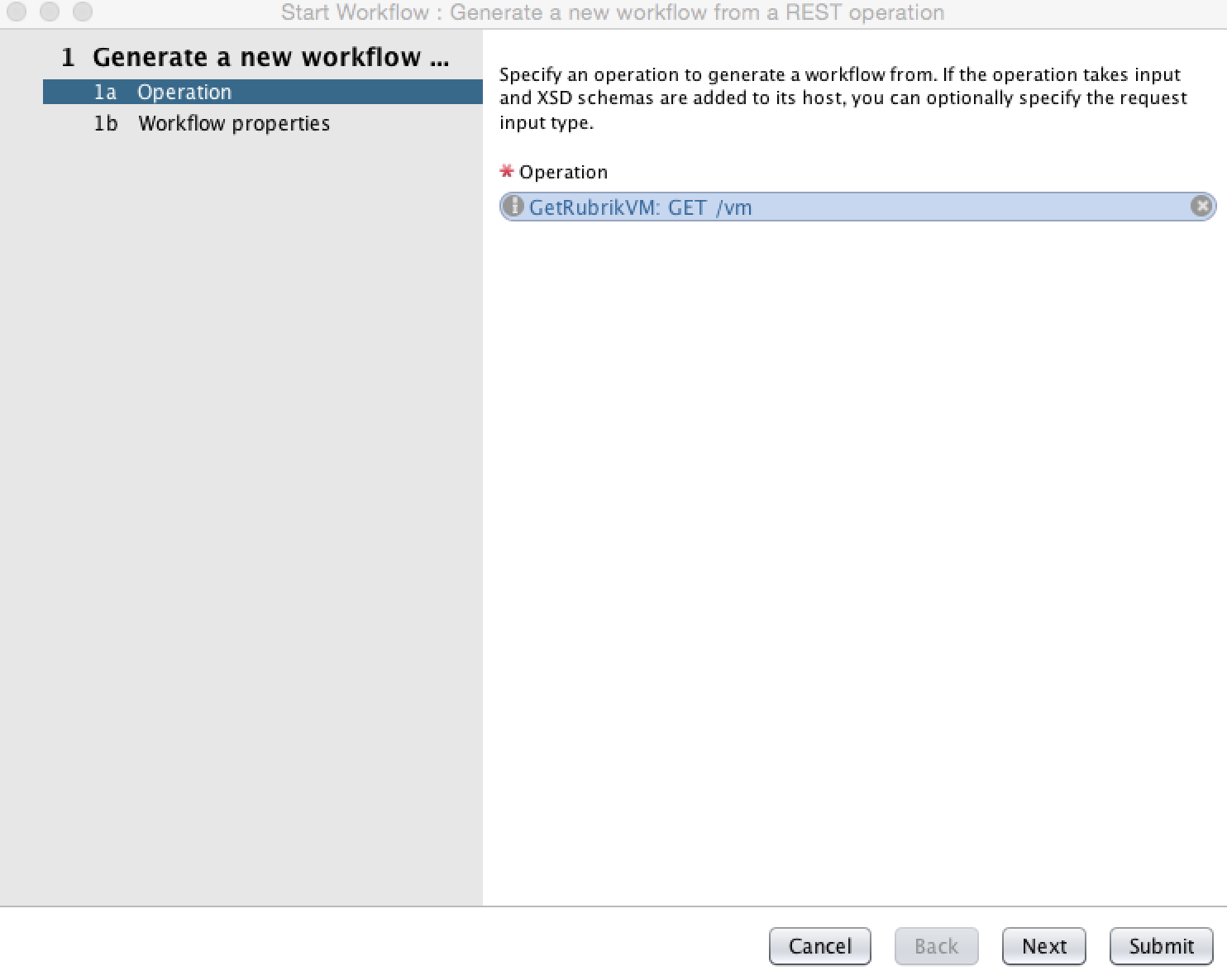 Prior to us jumping into the workflow, I want to take second to look at the REST Operation that we setup earlier. Just as a quick refresher, we previously added a REST operation for Get VM. If you want a quick reminder, we setup a GET operations on the /vm resource. We’ll use this operation in our workflow.