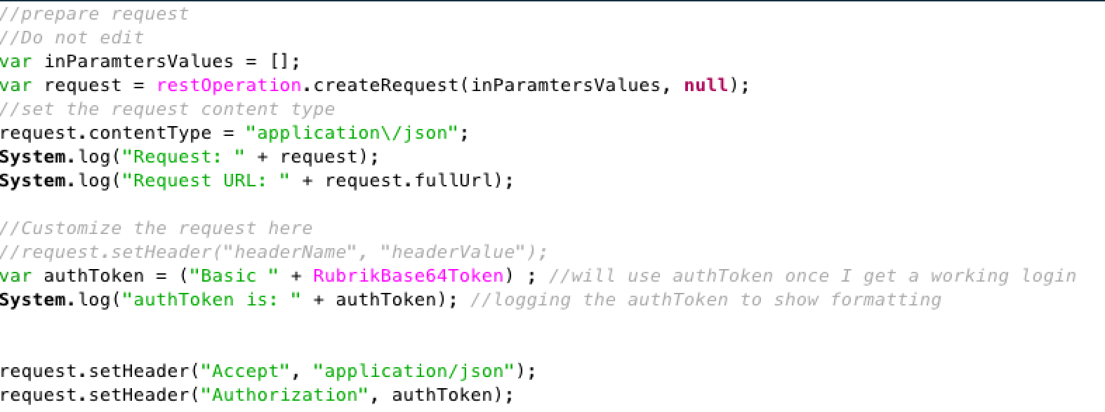 Under the “Customize request” we create a new variable for our authentication token. This is the Token we retrieved earlier with the “Basic " in front of it. We log the token in case we need to do further troubleshooting. Lastly, we make our requests and pass the header information over.