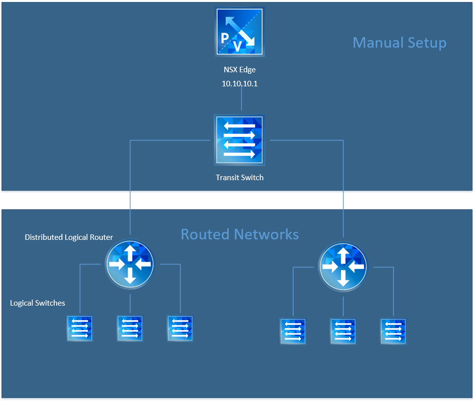 Luckily NSX has the ability to create routed networks and vRealize Automation can leverage this, to automatically setup a new network when we deploy blueprints. The initial setup requires setting up an NSX edge and a transit network. This is done manually to get the environment prepared for the automation piece. The diagram below shows the pieces that are manually created vs the routed networks which are automatically created through vRealize Automation.