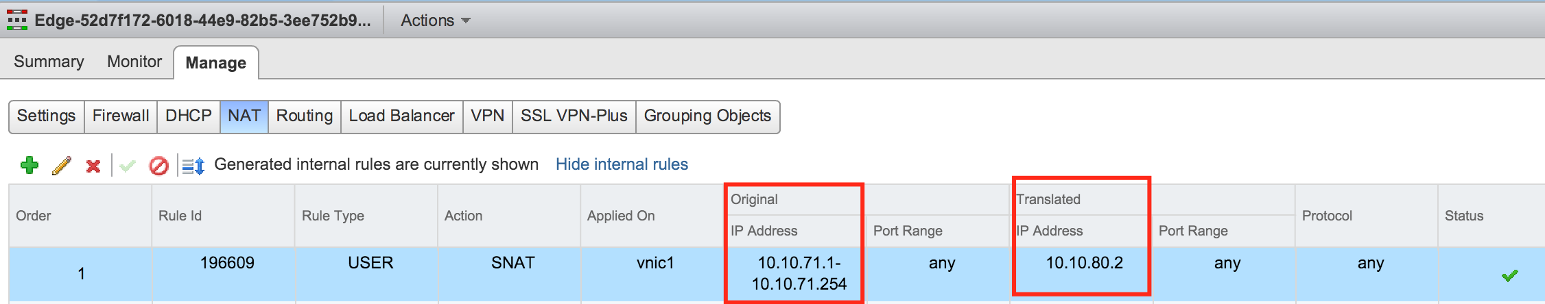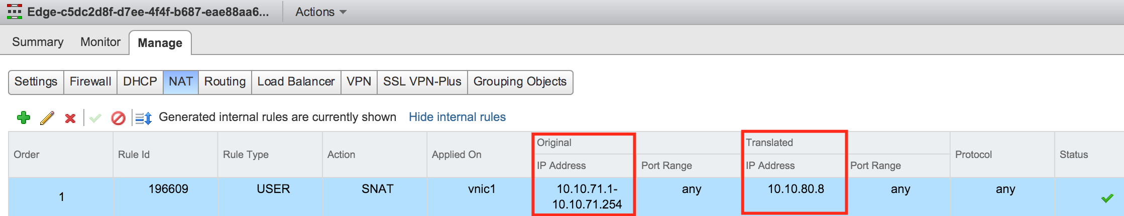 If we were to look at the second edge interface, you’ll notice that the internal IP Addresses are identical, but the uplink IP Addresses are different. The same range will be translated to a different IP Address.