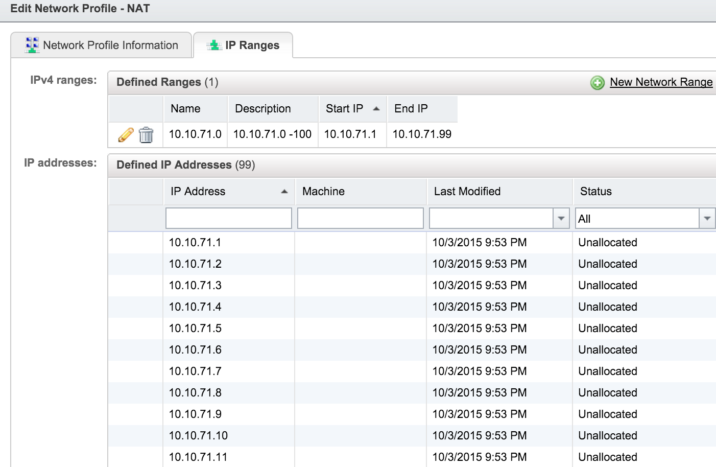 Next select the IP Ranges tab. Create a new network range and a set of starting and ending IP Addresses. These will be assigned to the virtual machines when they’re provisioned in this new network.