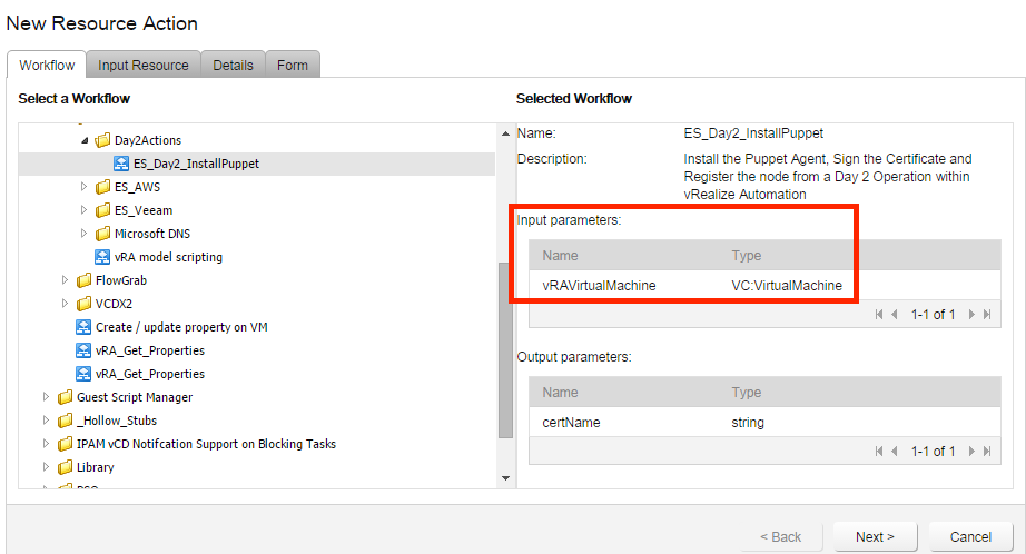 But often I run into a snag when trying to provision these types of actions. The examples below are actions I created to install the Puppet agent on a virtual machine. I already have a vRealize Orchestrator workflow that installs the Puppet agent on a virtual machine and the only input the workflow requires is a hostname. So I log into the vRealize Automation portal as a Service Architect and go to my Advanced Services to create a new resource action. I browse to the workflow I’ve created and select it from the list. Notice that the Input parameter shows only a single input named hostname and of type string.