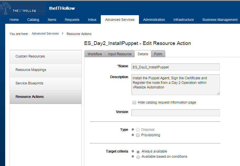 In case you’re wondering why I don’t just install puppet during the MachineProvisioned Stub in vRA, it’s because I’m running this in my home lab with only 10 puppet licenses. Adding this as a day 2 operation give me the flexibility to only install Puppet on nodes when I want to go test out some Puppet code. There are certainly many actions that could be used for a corporate environment though, like allowing users to storage vMotion their machine or snapshot\restore VMs at their leisure.