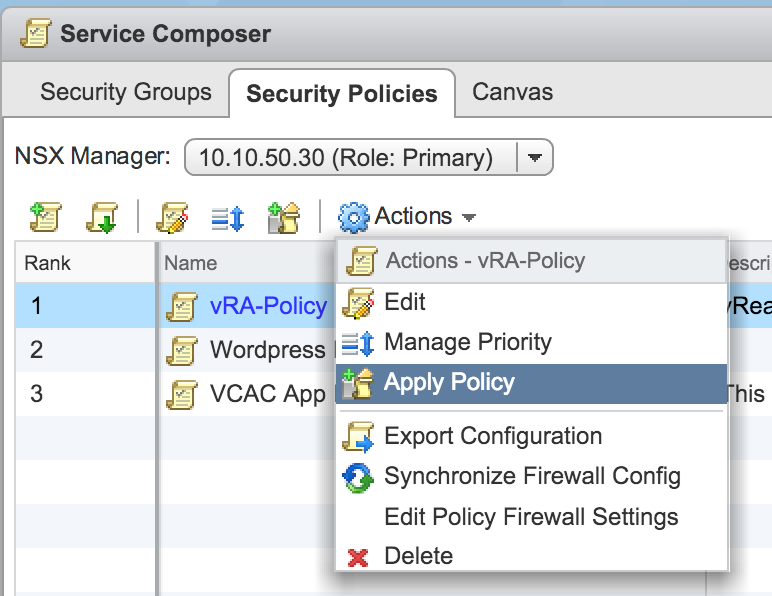 Now it’s time to set the policy. Go to the “Security Policies” tab in the Service Composer.