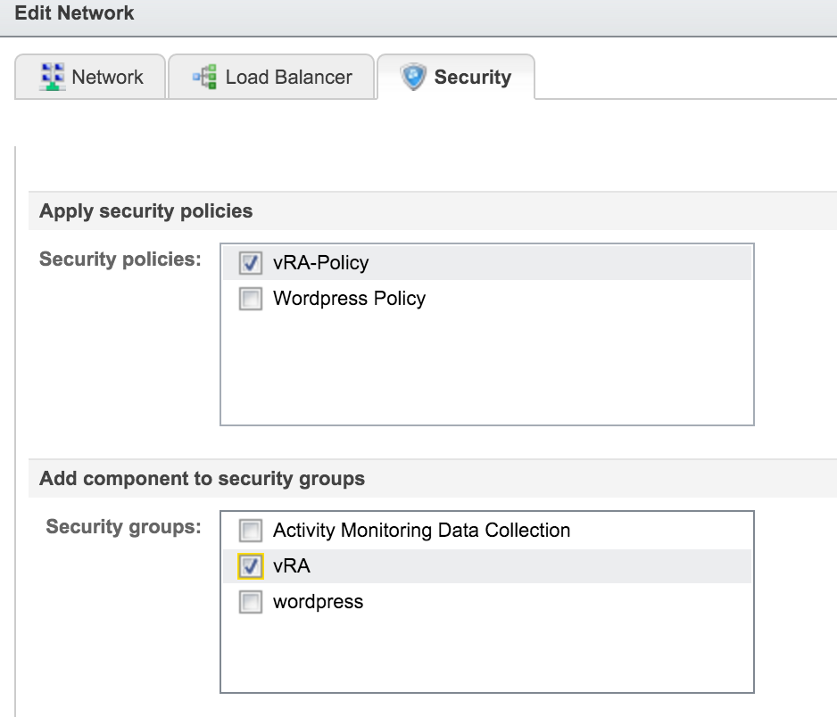 From here we can click on the “Security” tab and we can then manually select the Security Policies or Security Groups that we created earlier. However, in our case, we created a dynamic security group rule so we don’t need to manually apply these. As long as our virtual machines are deployed with a name that starts with “Hollow-” they’ll automatically be assigned correctly.
