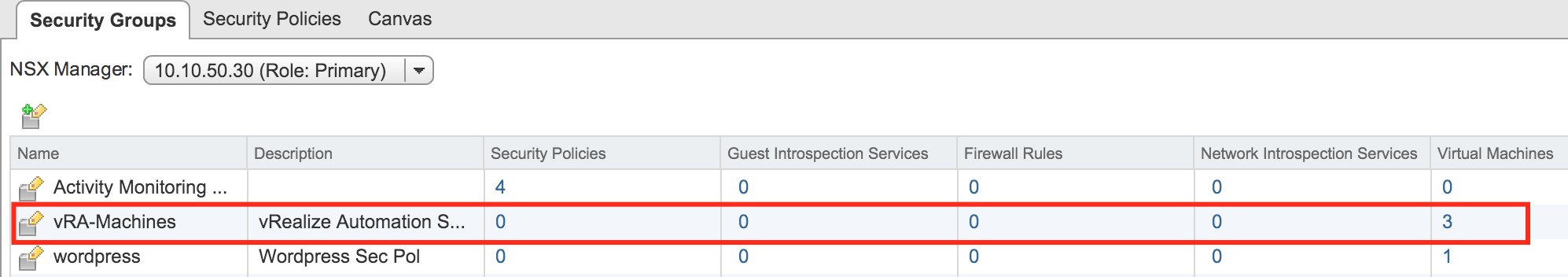 Now we can deploy some virtual machines from our blueprint. Once the build completes, we can look in NSX and see the security groups. We can see that there are now three virtual machines in the group. (The blueprint had three VMs in it).