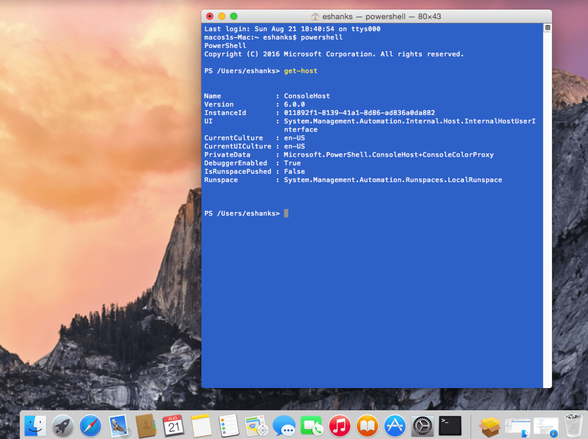Once the install is complete, open a Terminal Window and run “powershell”. Once you do this, you’ll be able to execute PowerShell commands. The example below I ran “get-host” to find the PowerShell version that was installed. I will note that the Install-Module commands don’t work quite yet so adding things like PowerCLI and AzureRM modules won’t be super easy to accomplish yet. This will probably change soon. After all, this is a very early release.
