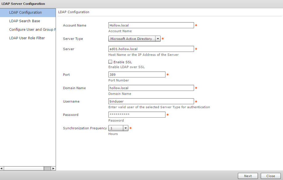 Fill out the first page of the LDAP Server Configuration Wizard that makes the connection with the Active Directory domain controller. Then click “Next”.