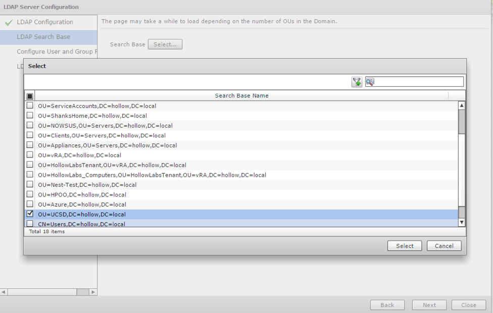 On the next screen select the base AD Object. This is the organization unit that will sync with Cisco UCS Director on the scheduled frequency. Many times it’s useful to only sync a specific OU instead of an entire directory tree for performance reasons. I created a new OU just for UCSD and place any of my users and groups in this OU. You can create your structure however it seems best for your organization. Then click “Next”.