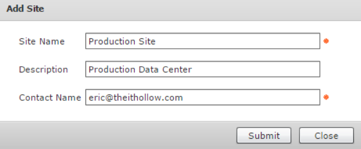 To add a Site go to the Administration drop down and the select “Physical Accounts”. Under the “Site Management” tab click “Add” to enter in information about your site. Click “Submit” and then enter in any additional sites that UCS Director will manage.
