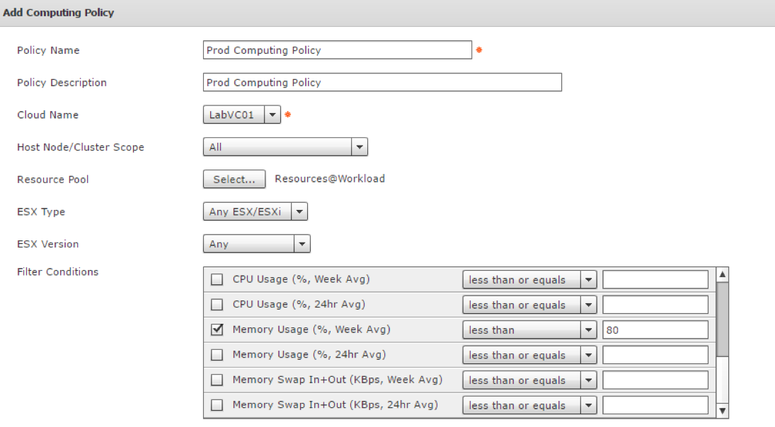 Filter Conditions: Select criteria for determining which host will have new virtual machines deployed on them. It’s important to select some criteria to ensure that the hosts are over utilized. Memory Usage %, CPU Usage % and Memory Swap are good options.