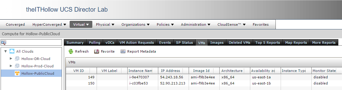 One of the differences between vRA and UCSD is that vRA will only manage the virtual machines that were deployed through vRA. UCSD on the other hand can manage machines that were not deployed through the solution. This means that when I look at the virtual machines in UCS Director that they will show up and can be powered of, powered off or destroyed.