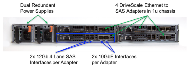 The DriveScale Adapter is shown below and contains dual power supplies and four DriveScale ethernet to SAS Adapters in the 1U chassis. DriveScale wants to use unused capacity in the top of rack switches for this iSCSI connection. It does not require any quality of service to the switches but does require the use of jumbo frames for the iSCSI traffic.