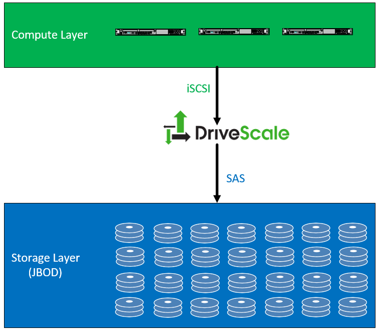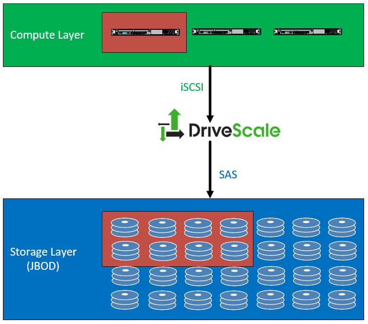 In the example below, we see a compute layer which is any number of physical servers, probably only providing compute and memory. Those servers attach to a DriveScale adapter (which is a one rack unit, four node server) attached via iSCSI. The DriveScale Adapter connects to direct attached JBOD (Just a Bunch of Disks) via a SAS connection.