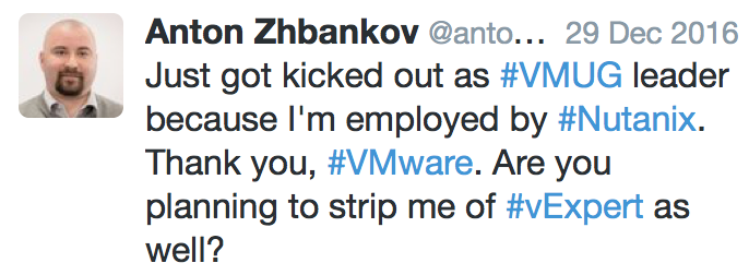 Now, at first this didn’t surprise me too much because there has been a rule that each VMUG chapter is supposed to comprise of more customers than partners as leaders. So, naturally I assumed that this was just fixing an imbalanced VMUG chapter. But as I asked more questions found out that it really was because Anton worked for Nutanix and working at this specific company excludes you from being a VMUG leader. Fellow blogger Matt Crape also wrote a post about this on his site. So now this tweet that had me concerned, has just simply made me sad.