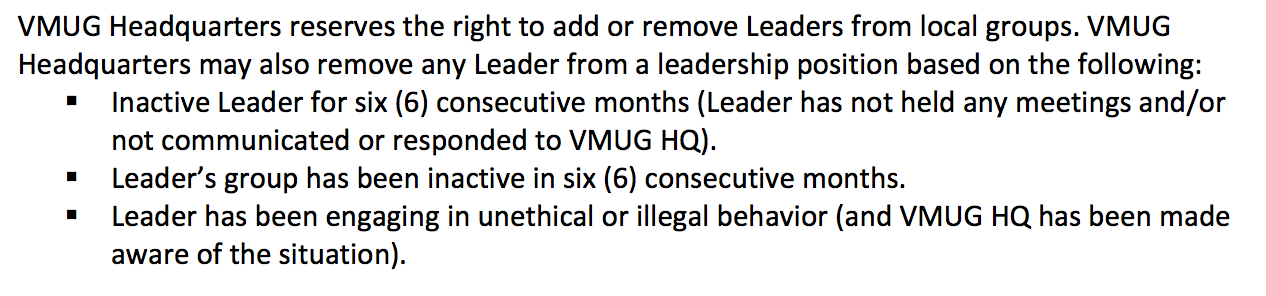 Like I said, VMUG is near and dear to my heart and I don’t want to see something bad happen to it. I also don’t want to see members leaving because of a loss of good leaders or bickering. It’s uncomfortable to see people fighting and people just don’t want to be around that kind of atmosphere.