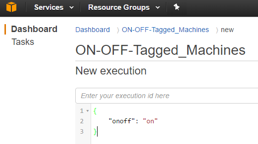 Now that you’ve created the “State Machine” you can execute the Step Functions. Click on the “New Execution” button if you just created your Step Function. Otherwise, you can go to the Step Functions dashboard and find the one you want to run. On the first screen, you’ll be asked to enter some inputs. Depending on your Step Functions, you may or may not need any inputs. For the example code that I used, we need a variable named “onoff” and a value which should be on or off. If you enter in any other value like “banana” the Step Function will default to the end.