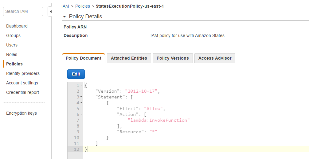 Before you create your Step Functions you will want to create an IAM role that has permissions to run your code. Open your AWS Console and go to the IAM section. Click Policies and then click “Create Policy.” Click “Select” next to “Create Your Own Policy. Give the policy a name and a description and then paste in the policy document. I’ve saved you some time and put the IAM Policy in my github repo so you can copy it. Validate and then create the policy.