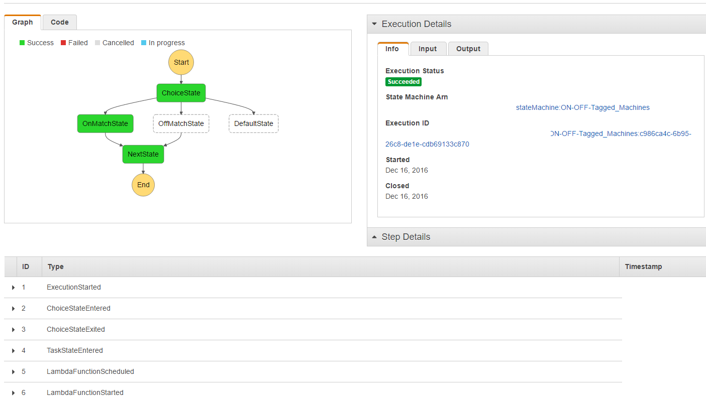As the Step Function runs, you’ll be able to watch the state in the console, as well as the detailed audit log and inputs/outputs.