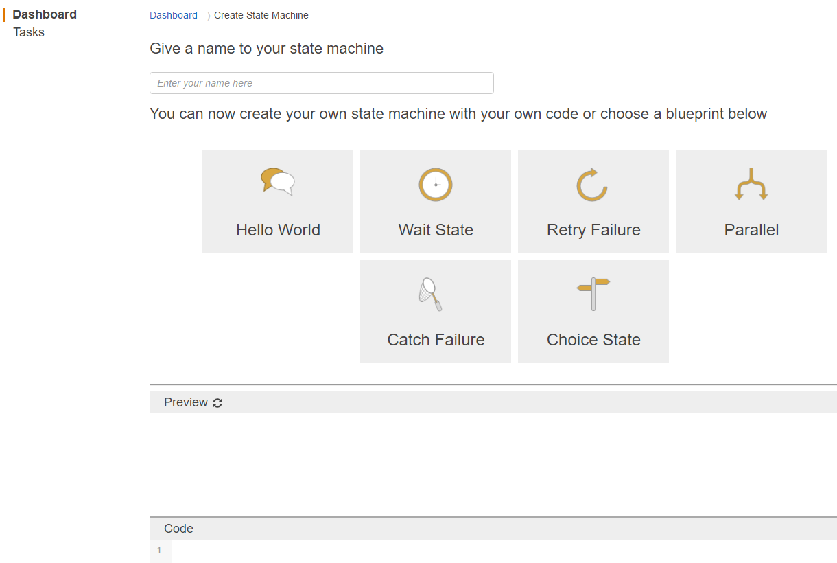 Once you’ve got your Lambda functions tested and working, we can place them behind our Step Functions. Open up the Step Functions menu in the AWS Console and it will take you to the State Machine dashboard. Click “Create a State Machine” button. You’ll need to name the state machine something descriptive and then we can use some of the blueprints below to get started. The square boxes below the name field will show you different methods on using Step Functions. Feel free to click any of those blueprints to see different ways of arranging your Step Functions. The “Preview” pane will take the blueprint you’ve selected and visually draw the logic gates that would be used in that blueprint. If you look below this, you’ll see the “Code” pane and the JSON that would be used to create those logic gates.