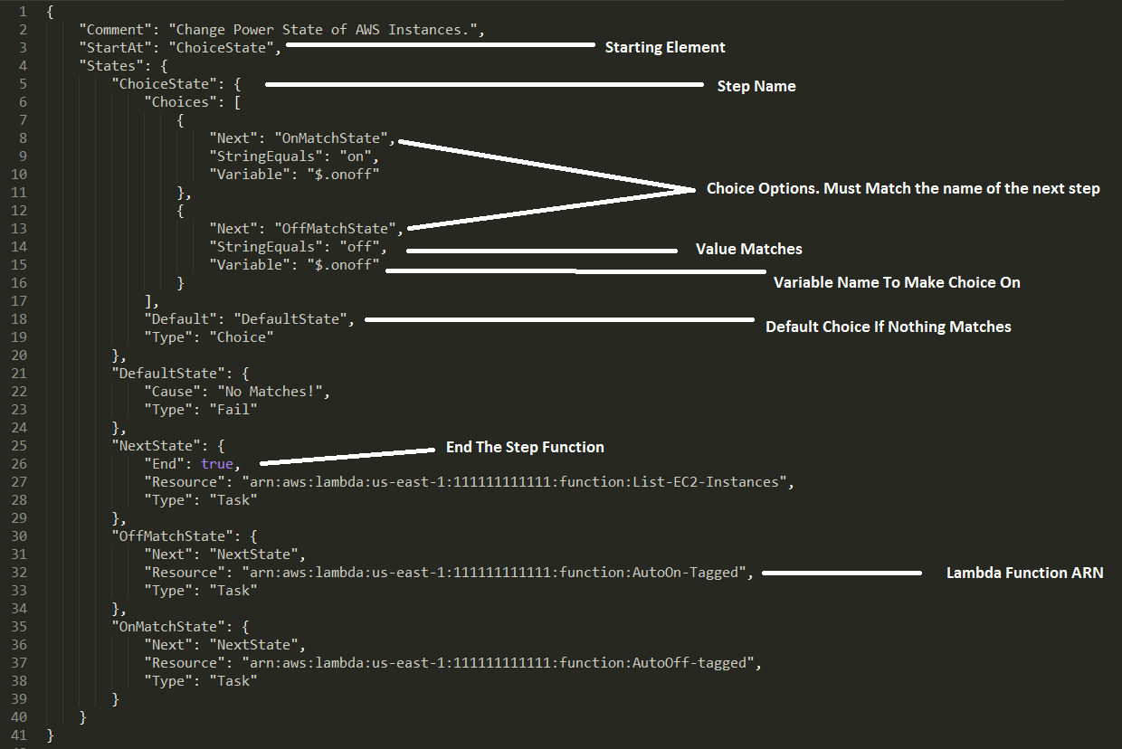Please note though, that you don’t need to use these blueprints at all, they’re just useful if you’re getting started. You can paste your JSON code in the code pane and click the refresh button in the preview pane at any time to see your code visually. I’ve decided that for this example I would use the “Choice State” blueprint as my getting started template and modify it to meet my needs. If you would like to download this code, check out my github repo here. I’ve made some notes in the screenshot to get you started on learning how the code is used.