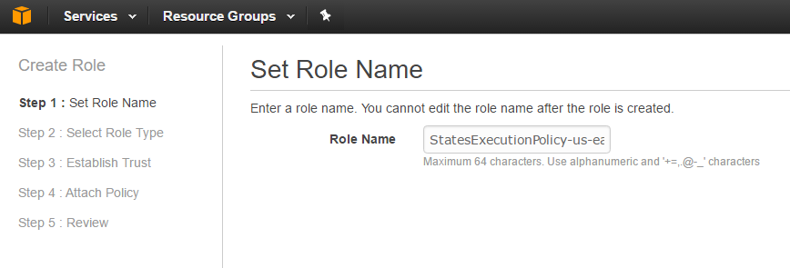 Once you have your IAM Policy created, click on the Roles link to attach the policy you just created and add it to a role. Click “Create New Role” to get started. Give the role a descriptive name and then click “Next Step.”