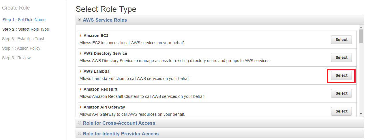 On the Role type screen select “AWS Lambda.”