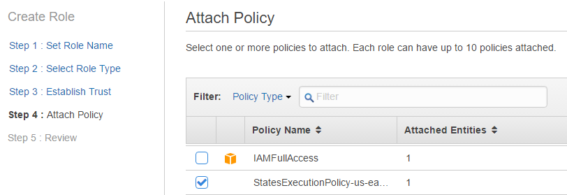 On the Attach Policy screen find and select the policy you created earlier. and then click “Next Step.”
