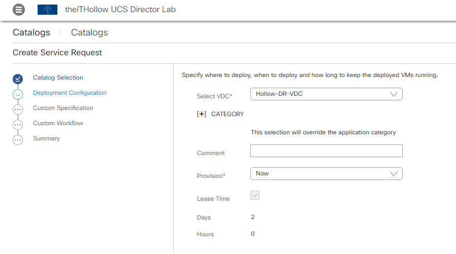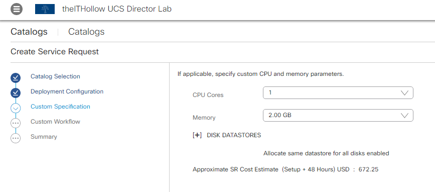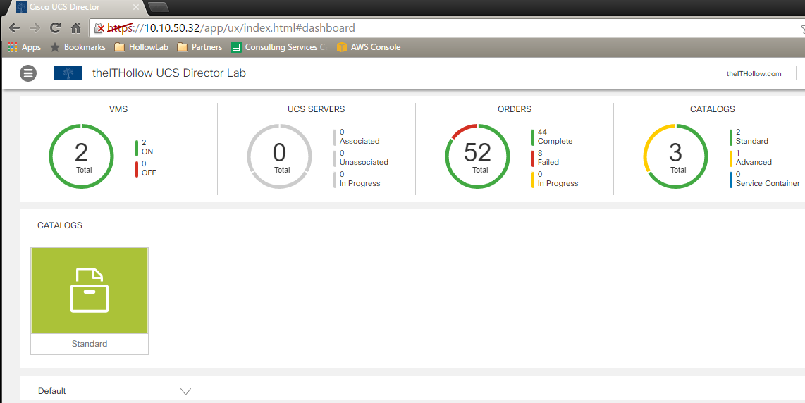 Cisco UCS Director Catalog Requests are the entire reason for having a cloud management platform in the first place. It’s the end user’s store for where they can request machines and services. To request a service, login to the UCS Director Portal with an account that has the “Service End-User” role. This role provides a different portal when logging in that only shows the user’s orders and catalogs and removes all of the administration options.